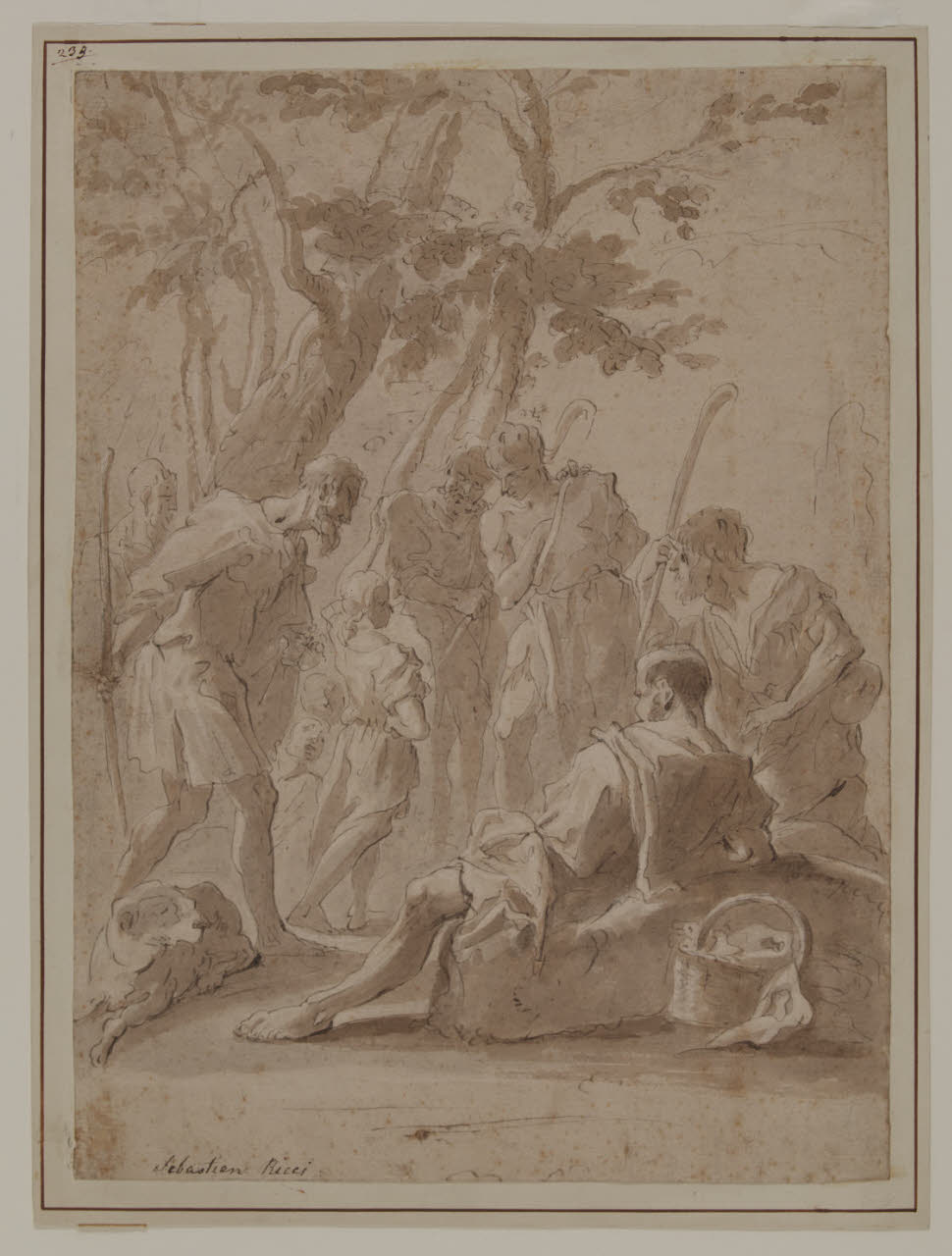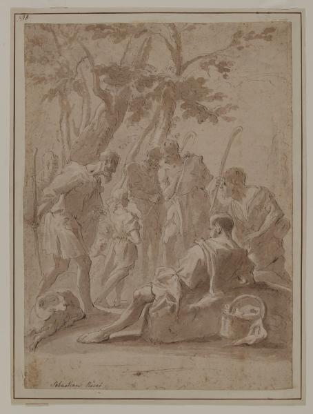 - NOTIZIE STORICO CRITICHE Già appartenuto alla collezione Gaffuri, questo foglio con Gesù bambino tra i pastori è stato ascritto da Precerutti Garberi (1969) a Sebastiano Ricci per la vena spiritosa con cui è trattato il soggetto. L'opera è collocabile cronologicamente all'inizio del XVIII secolo, quando sono più evidenti i punti di contatto tra l'arte del Ricci e quella del contemporaneo Pellegrini.