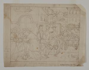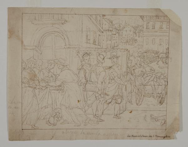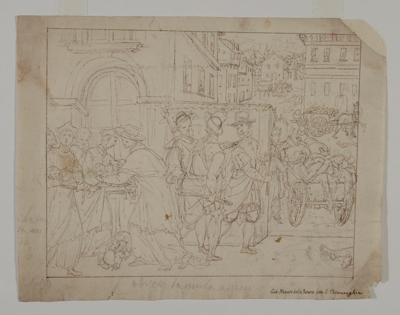 - NOTIZIE STORICO CRITICHE Il foglio, attribuito nell'inventario a Giovanni Battista Ricci da Novara, è oggi giustamente inserito nel catalogo di Giovanni Battista Della Rovere detto il Fiammenghino. Il disegno non trova riscontri nei quadroni carliani del Duomo di Milano; è probabile che sia un'idea per nuove scene della vita di san Carlo, da aggiungere a quelle realizzate tra 1602 e 1604, poi mai andate in porto in previsione del ciclo con i miracoli carliani, eseguito nel 1610 (Bora 1973). Spina Barelli (1959) mette in relazione il foglio con altri due, conservati alla Biblioteca Ambrosiana (Cod. F. 254 inf. n. 1459 e Cod. F. 254 inf. n. 1461) e raffiguranti figure decorative, attribuiti a Giovanni Mauro Della Rovere detto il Fiammenghino, evidenziando una stessa minuzia segnica. Bora (1973) osserva come il disegno sia contraddistinto da un'insolta verve narrativa, di tono quasi da stampa popolare e immediato e preciso nella descrizione dei fatti.