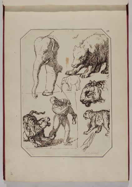 Studi di elefanti, teste di belve e domatore in atto di frustare una leonessa