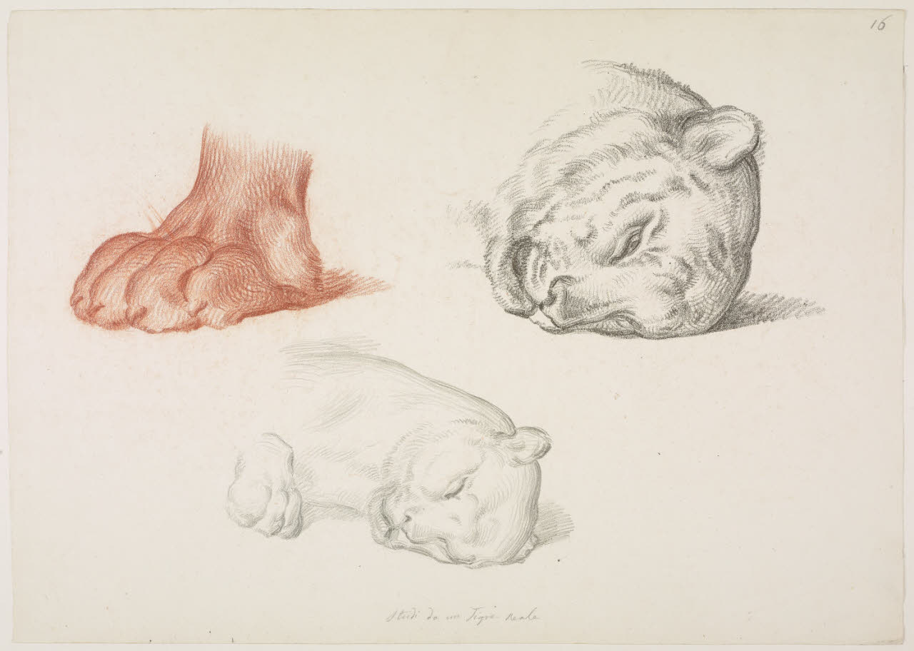 Due studi della testa addormentata e uno della zampa di una tigre reale