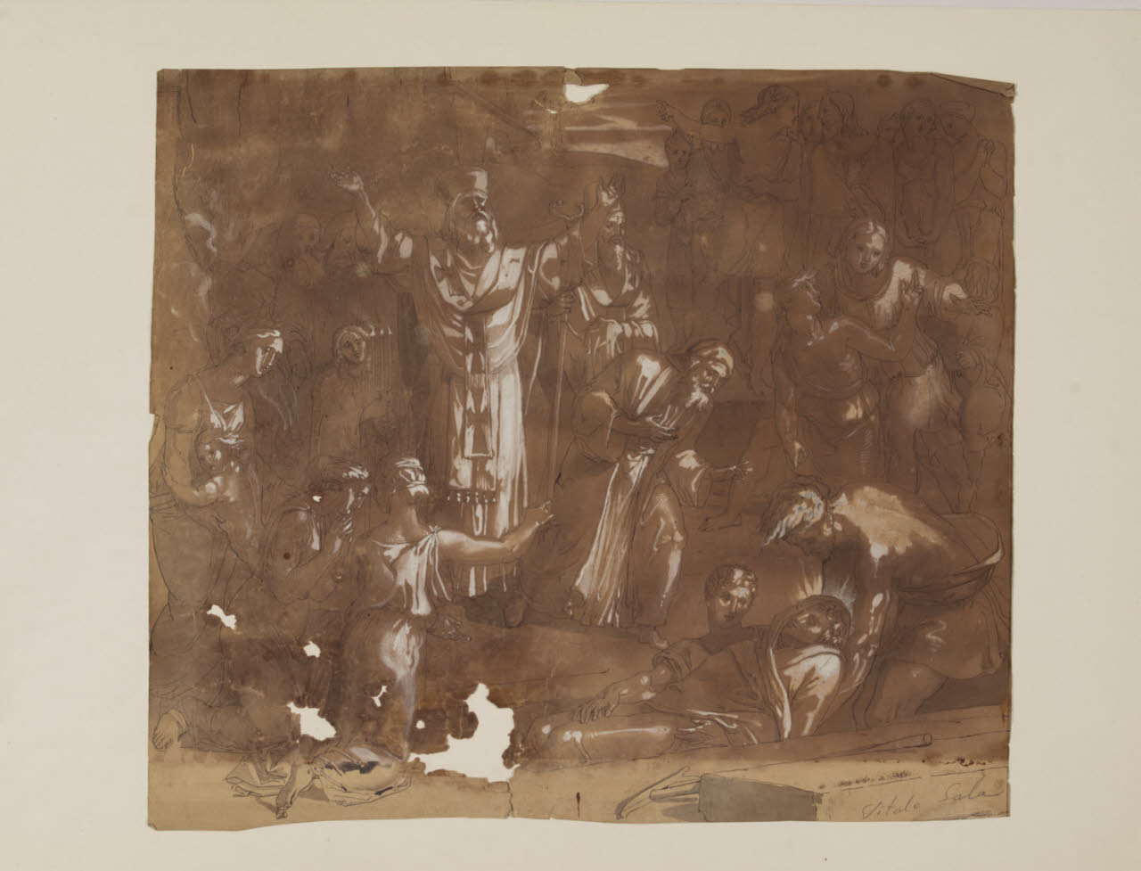 - NOTIZIE STORICO CRITICHE Il foglio presenta, al recto e al verso, due diversi studi per il "Rinvenimento del corpo di Santo Stefano" affrescato da Vitale Sala nel 1825 nel coro della Basilica di Santo Stefano Maggiore a Milano.
