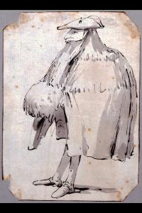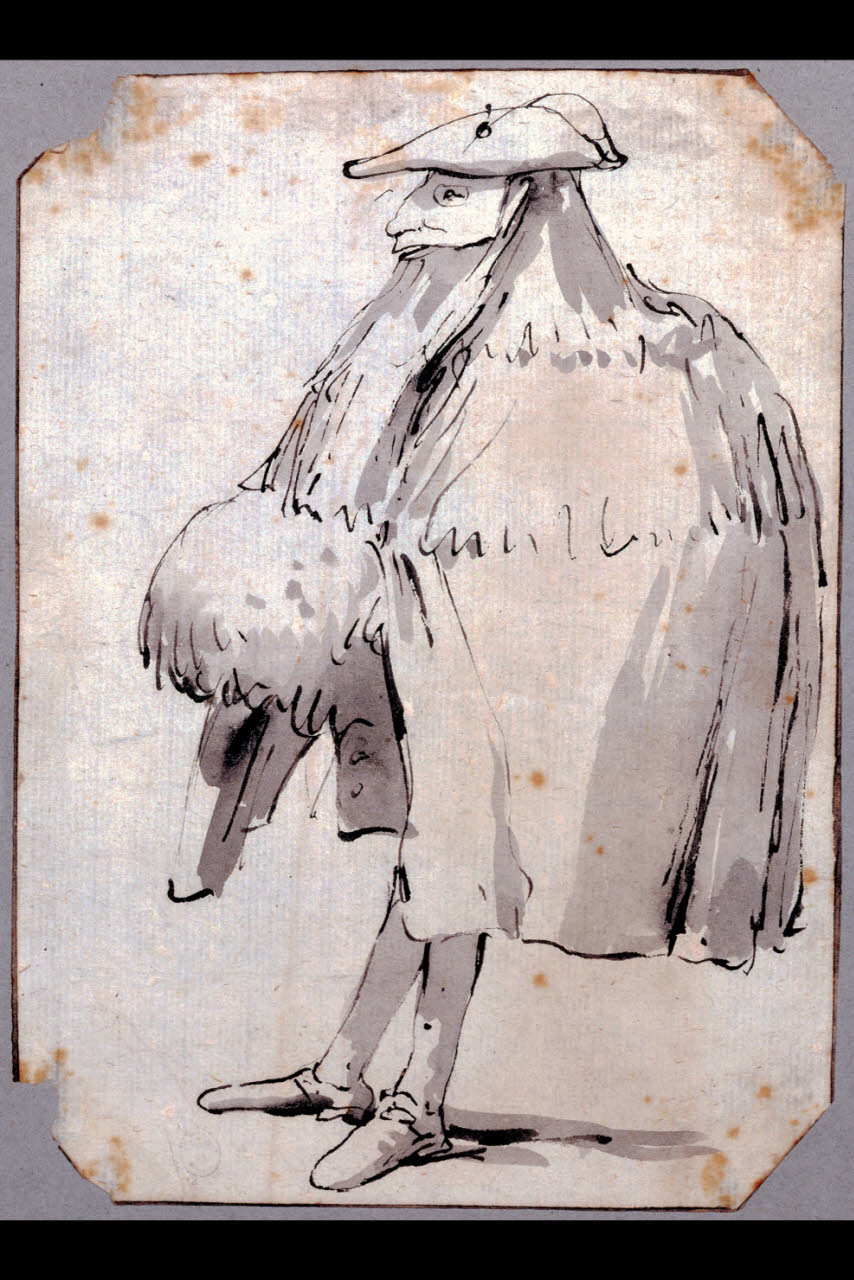 - NOTIZIE STORICO CRITICHE Il foglio proviene dalla raccolta di Gustavo Frizzoni e fa parte di un prezioso gruppo di caricature eseguite da Giambattista Tiepolo conservate presso il Gabinetto dei Disegni del Castello Sforzesco. Il ductus della penna assai sciolto e le ombre stese a pennello contribuiscono a conferire alla figura un fresco e momentaneo carattere umoristico. Nella produzione grafica di Giambattista Tiepolo si conoscono oltre duecento altri disegni analoghi di caricature, conservati in diversi musei e collezioni private. L'omogeneità del formato dei fogli del Castello Sforzesco, molti dei quali con gli angoli tagliati, oltre a similitudini tecniche, hanno fatto ipotizzare per essi una datazione ravvicinata fra il 1755 e il 1760. Morassi (1959) riteneva che essi andassero collocati cronologicamente al tempo della decorazione della villa Valmarana a Vicenza nel 1757, rilevando come la vena umoristica fosse ben presto apparsa nella produzione di Giambattista e come il figlio Domenico, ereditandola, l'avrebbe potenziata. In Tiepolo le caricature hanno soluzioni di volta in volta libere e non trovano riscontri puntuali nei personaggi illustri del suo tempo, ma sono piuttosto volte a esasperare, caricandoli, atteggiamenti e aspetti esteriori dei diversi ceti della società veneziana: alcune attitudini (figure di spalle, in piedi di profilo, sedute, ecc...) si possono individuare in una serie così ricca, senza mai una ripetizione, a testimonianza di una vena inventiva inesauribile.