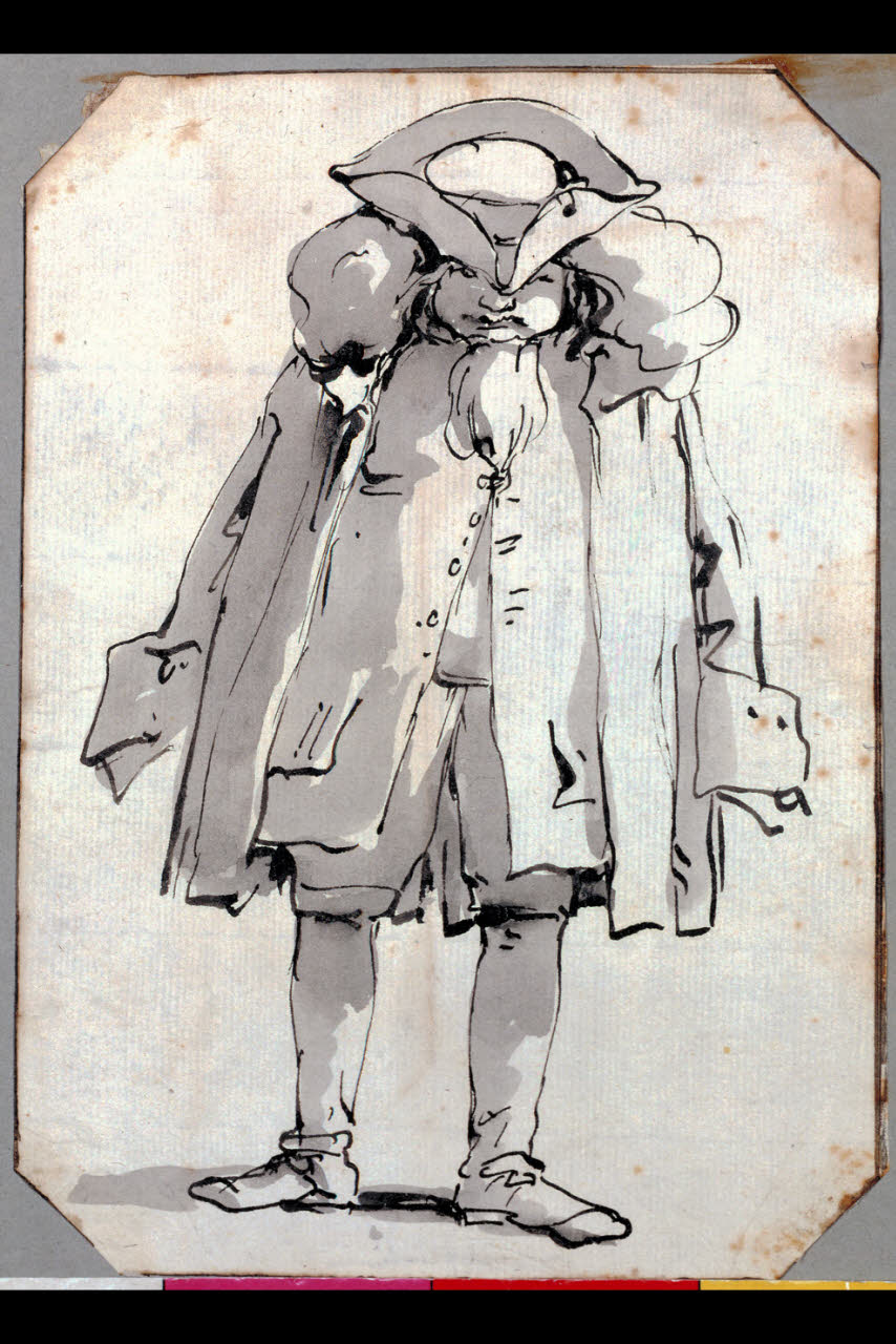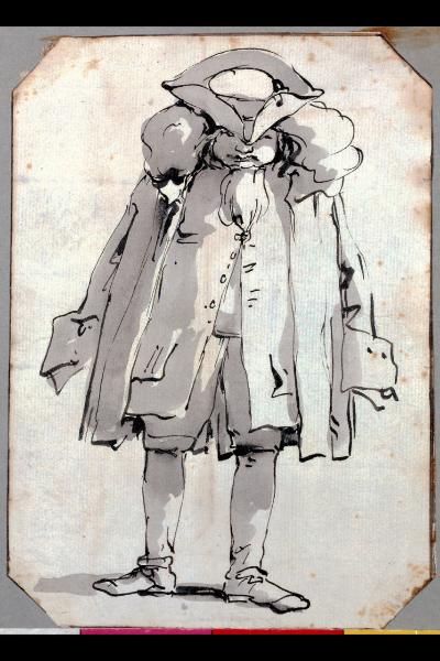 - NOTIZIE STORICO CRITICHE Il foglio proviene dalla raccolta di Gustavo Frizzoni e fa parte di un prezioso gruppo di caricature eseguite da Giambattista Tiepolo conservate presso il Gabinetto dei Disegni del Castello Sforzesco. Il ductus della penna assai sciolto e le ombre stese a pennello contribuiscono a conferire alla figura un fresco e momentaneo carattere umoristico. Nella produzione grafica di Giambattista Tiepolo si conoscono oltre duecento altri disegni analoghi di caricature, conservati in diversi musei e collezioni private. L'omogeneità del formato dei fogli del Castello Sforzesco, molti dei quali con gli angoli tagliati, oltre a similitudini tecniche, hanno fatto ipotizzare per essi una datazione ravvicinata fra il 1755 e il 1760. Morassi (1959) riteneva che essi andassero collocati cronologicamente al tempo della decorazione della villa Valmarana a Vicenza nel 1757, rilevando come la vena umoristica fosse ben presto apparsa nella produzione di Giambattista e come il figlio Domenico, ereditandola, l'avrebbe potenziata. In Tiepolo le caricature hanno soluzioni di volta in volta libere e non trovano riscontri puntuali nei personaggi illustri del suo tempo, ma sono piuttosto volte a esasperare, caricandoli, atteggiamenti e aspetti esteriori dei diversi ceti della società veneziana: alcune attitudini (figure di spalle, in piedi di profilo, sedute, ecc...) si possono individuare in una serie così ricca, senza mai una ripetizione, a testimonianza di una vena inventiva inesauribile.