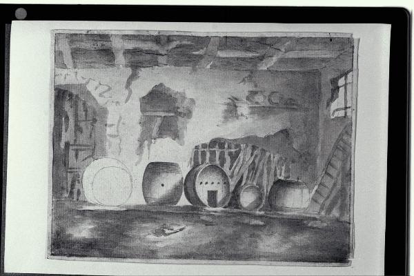 - NOTIZIE STORICO CRITICHE Questo disegno del pittore e disegnatore bresciano Andrea Torresani illustra l'interno di una cantina: l'architettura fatiscente dell'ambiente si accompagna a elementi tipici del frasario dell'artista caratterizzato dalla rappresentazione di oggetti della vita quotidiana, in stretto legame con la pittura della realtà tanto cara alla tradizione lombarda.