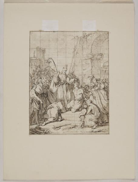 - NOTIZIE STORICO CRITICHE A vista della quadrettatura e del medesimo soggetto iconografico, il foglio risulta molto propabilmente un disegno preparatorio per la pala con "San Nicola di Bari nell’atto di liberare tre innocenti condannati a morte" conservata presso la Parrocchia San Nicolò vescovo di Zanica (BG). Eseguita su incarico di Leonino Secco Suardo nel 1837 - committente per cui eseguì anche "Zenobia salvata da alcuni pastori dalle acque del fiume Arasse" - la pala diede all'artista grande successo e ne ampliò la fama oltre i confini dell’ambito bergamasco. Con questa tavola, lo stesso anno Trécourt esordì all'annuale mostra dell'Accademia di Brera, ricevendo - oltre ad alcune critiche - gli apprezzamenti di Giuseppe Sacchi.