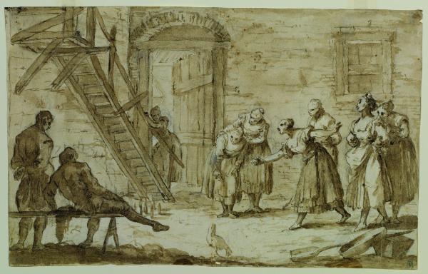 - NOTIZIE STORICO CRITICHE Appartenuto alla prestigiosa collezione di Giovanni Morelli, questo disegno illustra un gruppo di contadinelle nell'aia di un casolare alle prese con il gioco dei birilli, davanti allo sguardo attento di due uomini in primo piano. Già attribuito a Zais dal suo possessore e poi a Zuccarelli nell'inventario museale, è stato correttamente assegnato a Gaspare Diziani da Precerutti Garberi (1969, 1971). A supporto di quest'attribuzione ricordiamo la produzione di scene di genere dipinte da parte di Diziani che da Zugno Tauri nel suo catalogo ragionato (1971) colloca negli anni attorno al 1750. I temi sono tratti dalla vita quotidiana e dal mondo contadino in genere e sono affrontati con un'analitica descrizione degli ambienti. In particolare, per le scene rustiche come quella in esame, Diziani riproduceva le architetture tipiche della Val Belluna, dai muri a larghe pietre ai portali arcuati, alle scale. A livello stilistico si intravvedono ancora alcune caratteristiche grafiche pertinenti alla fase matura dell'artista, come le abbreviature del segno, le acquarellature e l'impiego di fiure in primo piano in contro luce.\nL'ipotesi avanzata di un'attribuzione di questo foglio al figlio di Gaspare, Antonio Diziani, non è stata accolta dalla maggior parte della critica: Bora (1994) sostiene che la finitezza stilistica e il ductus analitico siano da collegarsi all'esigenza dell'artista di mostrare un "disegno di presentazione" al proprio committente.