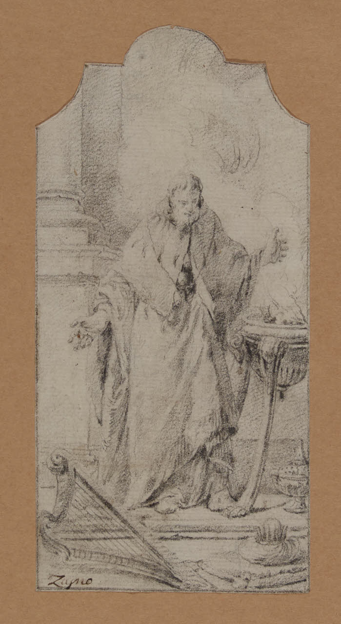 - NOTIZIE STORICO CRITICHE Il piccolo foglio, un tempo facente parte della collezione di Paolo Gaffuri, è assegnato a Francesco Zugno e reca in basso a sinistra l'iscrizione "Zugno" a penna in grafia probabilmente ottocentesca. Il disegno in esame illustra il Re David ed è inserito all'interno di una cornice centinata, come un altro foglio dello stesso Zugno al Castello Sforzesco (cfr. A 2027).