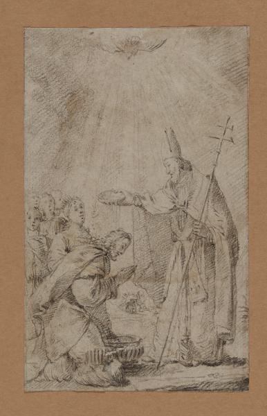 - NOTIZIE STORICO CRITICHE Il disegno, attribuito a Francesco Zugno da Pilo (1958-1959), è da mettere in rapporto con la pala di San Gregorio battezzante il re degli Armeni che l'artista terminò il 29 agosto 1740 per la chiesa di San Lazzaro degli Armeni a Venezia. La commissione, che interessava anche altri dipinti per la stessa chiesa, sarebbe da datare al 1737 e fu la prima ricevuta dallo Zugno dopo la sua formazione presso Tiepolo e il successivo affrancamento dal maestro. Il foglio in esame è inoltre da mettere in relazione con il modellino dello stesso soggetto nella Pinacoteca di San Lazzaro a Venezia che presenta alcune varianti rispetto alla versione finale del dipinto.