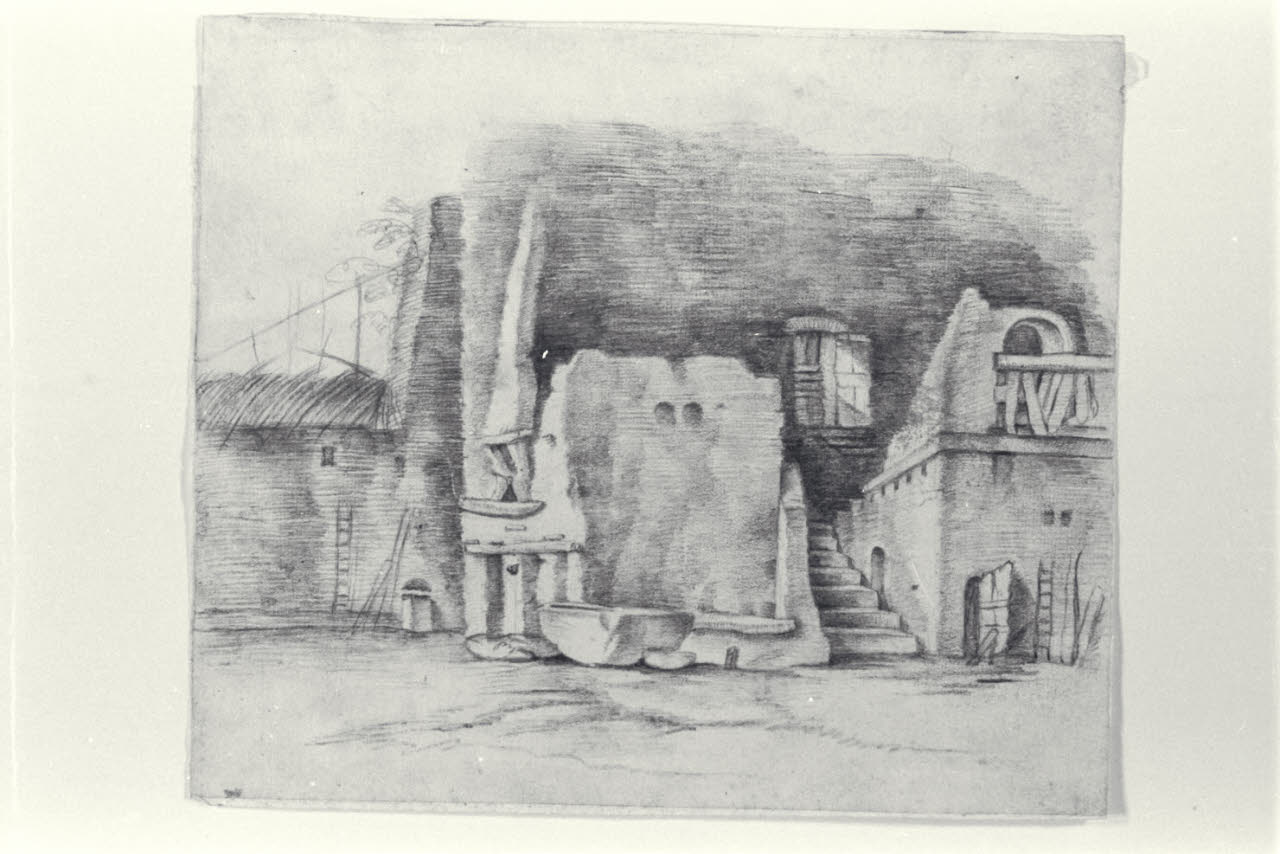 - NOTIZIE STORICO CRITICHE Proveniente dalla collezione di Paolo Gaffuri, questo disegno del pittore bresciano Andrea Torregiani illustra alcuni casolari rustici fronteggiati da un cortile. Il motivo dei casolari rustici insieme a quello delle ambientazioni paestaggistiche sono uno dei temi prediletti della poetica grafica dell'artista.