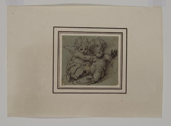 - NOTIZIE STORICO CRITICHE Appartenuto alla collezione del Principe Alberico XII Barbiano di Belgioioso, il foglio in esame risulta essere una copia parziale da un disegno con Putti di Parmigianino, oggi conservato a Chatsworth (inv. 792 A,B) (cfr. Gnann 2007, band I, p. 431, kat. 515 recto).