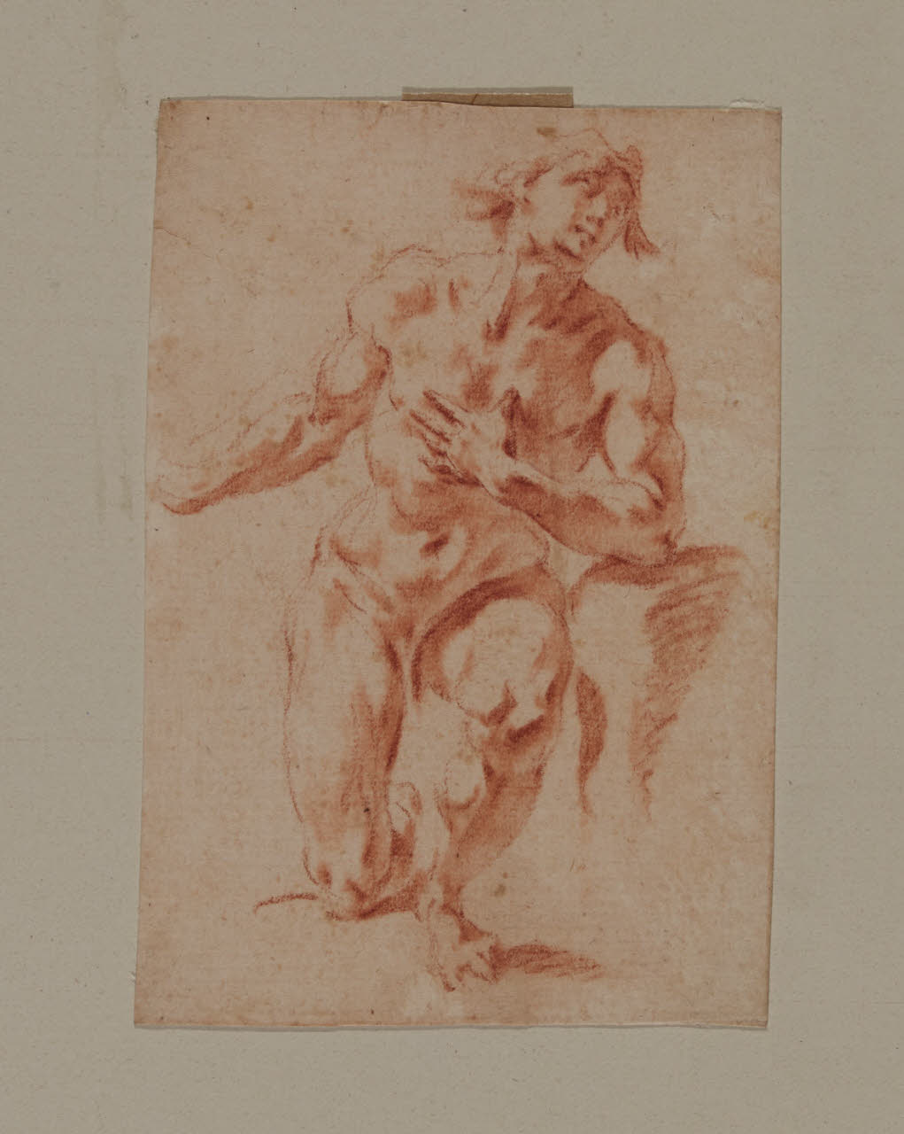 - NOTIZIE STORICO CRITICHE Il nucleo di disegni, corredati di un montaggio di collezione Barbiano di Belgioioso, è composto da una serie di "Accademie", studi di nudo virili raffigurati in pose diverse e colti da svariate angolature, dall'espressività marcata e dalle pose spesso dinoccolate. Il gruppo di fogli è stato attribuito, a livello inventariale, a Federico Bencovich (1677-1753), artista autore di numerose "Accademie virili" e la cui attività grafica è tuttora dibattuta. Il disegno è oggi sprovvisto di montaggio di collezione, la cui esistenza in passato è testimoniata da una matrice digitale in bianco e nero. \nNell'inventario del 1814 dei beni di Alberico XII Barbiano di Belgioioso (trascritto in M. Forni, "Abitare da principe. Le residenze e le collezioni di Alberico XII Barbiano di Belgiojoso", 2020), nella Cartella I "che contiene altri disegni" sono registrati "51 ignudi piccoli a lapis rosso", stimati £ 30: è ipotizzabile che si riferisca alla serie in analisi.