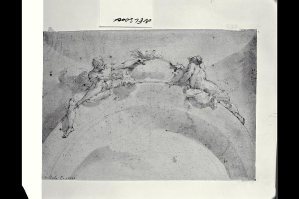 Due figure nude, una maschile e una femminile, sedute sopra un arco in atto di indicare il centro (Particolari decorativi per interni di sale)