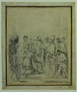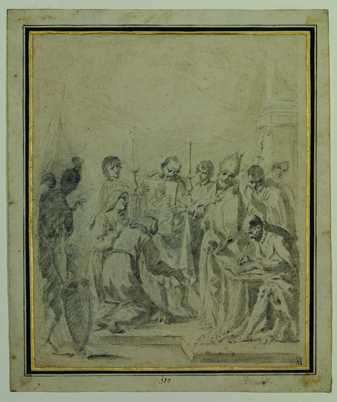 - NOTIZIE STORICO CRITICHE Già attribuito a scuola veneta, nonostante una prima attribuzione a scuola bolognese XVIII sec., il foglio venne ascritto da Precerutti Garberi (1969) alla scuola del Piazzetta, sebbene vi riconoscesse una certa "atmosfera bolognese-veneta". Restituito ad Ercole Graziani il Giovane (Frisoni, scheda, in Bora 1994), il foglio illustra la consegna, avvenuta secondo la tradizione locale l'8 maggio del 1160, dell'immagine della Madonna di San Luca, portata dall'Oriente da un pellegrino, a due sorelle eremite sul Colle della Guardia perchè la custodissero. Un altro disegno del Graziani conservato oggi al Prado mostra una variante dello stesso soggetto. Le due versioni dovettero poi confluire in un'incisione di Ludovico Mattioli (cfr. Gaeta Bertà 1974, n. 475). Una terza redazione del tema, molto simile alla versione del Castello Sforzesco, si conserva in collezione privata. La vivace caratterizzazione dei volti e il ductus grafico che già risente del "barocchetto" permettono di proporre una datazione attorno al 1735 per questo foglio.\nL'opera in esame è identificabile con uno dei quattro disegni di provenienza Morelli pervenuti alle collezioni civiche a seguito di uno scambio con la Pinacoteca Ambrosiana (Frizzoni 1907).