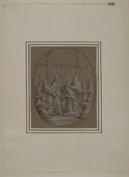 - NOTIZIE STORICO CRITICHE La serie è costituita da venti disegni con episodi della "Vita di sant'Ambrogio", stagliati come bassorilievi entro ovati. Come indicato dalla Garberi nel suo saggio (1993), si tratta di studi definitivi per i venti piccoli medaglioni a monocromo realizzati ad affresco nel soffitto della cripta della basilica di Sant'Ambrogio. Gli affreschi, dieci dei quali distrutti nei bombardamenti del 1943, sono opera di Giambattista Sassi, incorniciati da fregi in stucco di Giambattista Aliprandi; l'intero apparato decorativo è databile al 1730 circa. I disegni sono improntati a un linguaggio raffinato, morbido e sciolto, con guizzi luminosi dati dal gessetto bianco; la fresca immediatezza, l'elegante virtuosismo, la stesura rapida ed estrosa sono caratteristiche tipiche del linguaggio barocchetto riscontrabili nell'attività artistica del Sassi soprattutto negli anni prossimi al terzo decennio del XVIII secolo.\nIl foglio mostra i santi Ambrogio e Agostino: quest'ultimo abbracciò il cristianesimo grazie anche all'esempio di Ambrogio.\nNell'inventario del 1814 dei beni di Alberico XII Barbiano di Belgioioso (trascritto in M. Forni, "Abitare da principe. Le residenze e le collezioni di Alberico XII Barbiano di Belgiojoso", 2020), nella Cartella I "che contiene altri disegni" sono registrati "20 altri rappresentanti la vita di S. Ambrogio", stimati £ 15: plausibile che si riferisca proprio alla serie in analisi.