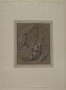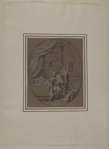- NOTIZIE STORICO CRITICHE La serie è costituita da venti disegni con episodi della "Vita di sant'Ambrogio", stagliati come bassorilievi entro ovati. Come indicato dalla Garberi nel suo saggio (1993), si tratta di studi definitivi per i venti piccoli medaglioni a monocromo realizzati ad affresco nel soffitto della cripta della basilica di Sant'Ambrogio. Gli affreschi, dieci dei quali distrutti nei bombardamenti del 1943, sono opera di Giambattista Sassi, incorniciati da fregi in stucco di Giambattista Aliprandi; l'intero apparato decorativo è databile al 1730 circa. I disegni sono improntati a un linguaggio raffinato, morbido e sciolto, con guizzi luminosi dati dal gessetto bianco; la fresca immediatezza, l'elegante virtuosismo, la stesura rapida ed estrosa sono caratteristiche tipiche del linguaggio barocchetto riscontrabili nell'attività artistica del Sassi soprattutto negli anni prossimi al terzo decennio del XVIII secolo.\nIl foglio mostra Ambrogio nei panni di dottore della Chiesa.\nNell'inventario del 1814 dei beni di Alberico XII Barbiano di Belgioioso (trascritto in M. Forni, "Abitare da principe. Le residenze e le collezioni di Alberico XII Barbiano di Belgiojoso", 2020), nella Cartella I "che contiene altri disegni" sono registrati "20 altri rappresentanti la vita di S. Ambrogio", stimati £ 15: plausibile che si riferisca proprio alla serie in analisi.