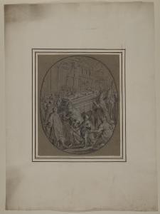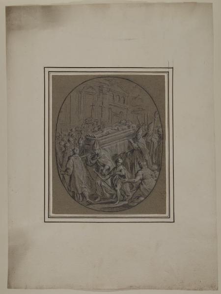 • NOTIZIE STORICO CRITICHE La serie è costituita da venti disegni con episodi della "Vita di sant'Ambrogio", stagliati come bassorilievi entro ovati. Come indicato dalla Garberi nel suo saggio (1993), si tratta di studi definitivi per i venti piccoli medaglioni a monocromo realizzati ad affresco nel soffitto della cripta della basilica di Sant'Ambrogio. Gli affreschi, dieci dei quali distrutti nei bombardamenti del 1943, sono opera di Giambattista Sassi, incorniciati da fregi in stucco di Giambattista Aliprandi; l'intero apparato decorativo è databile al 1730 circa. I disegni sono improntati a un linguaggio raffinato, morbido e sciolto, con guizzi luminosi dati dal gessetto bianco; la fresca immediatezza, l'elegante virtuosismo, la stesura rapida ed estrosa sono caratteristiche tipiche del linguaggio barocchetto riscontrabili nell'attività artistica del Sassi soprattutto negli anni prossimi al terzo decennio del XVIII secolo.\nIl foglio mostra la traslazione delle salme dei martiri Gervaso e Protaso nella basilica milanese poi dedicata ad Ambrogio.\nNell'inventario del 1814 dei beni di Alberico XII Barbiano di Belgioioso (trascritto in M. Forni, "Abitare da principe. Le residenze e le collezioni di Alberico XII Barbiano di Belgiojoso", 2020), nella Cartella I "che contiene altri disegni" sono registrati "20 altri rappresentanti la vita di S. Ambrogio", stimati £ 15: plausibile che si riferisca proprio alla serie in analisi.