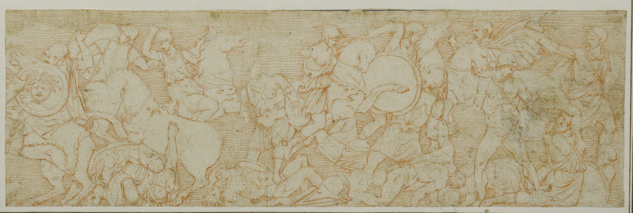 - NOTIZIE STORICO CRITICHE Già appartenuto alla collezione Trivulzio, questo disegno cinquecentesco riproduce un frammento del fregio frontale di un sarcofago oggi conservato presso il Museo Pio Clementino (inv. MV896).\nIl sarcofago, databile al 230-250 d.C., raffigura una scena di battaglia tra Gregi e Amazzoni. Il foglio è montato insieme ad un altro studio di un rilievo con la Sottomissione dei barbari ad un generale romano (inv. D 94).