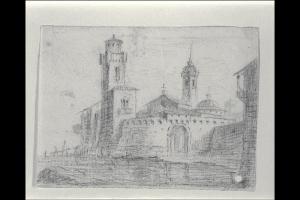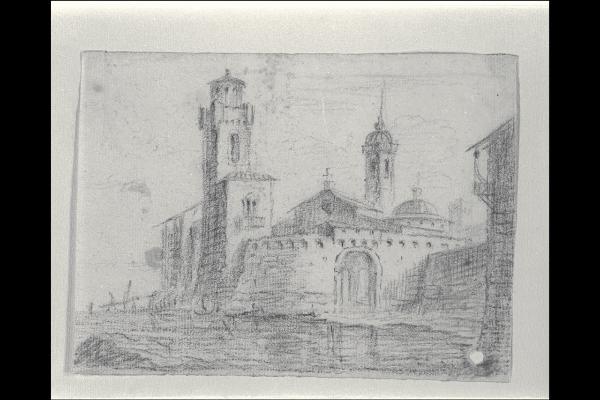 Chiesa con campanile e torre sulla laguna. Chiesa con campanile e torre sulla laguna