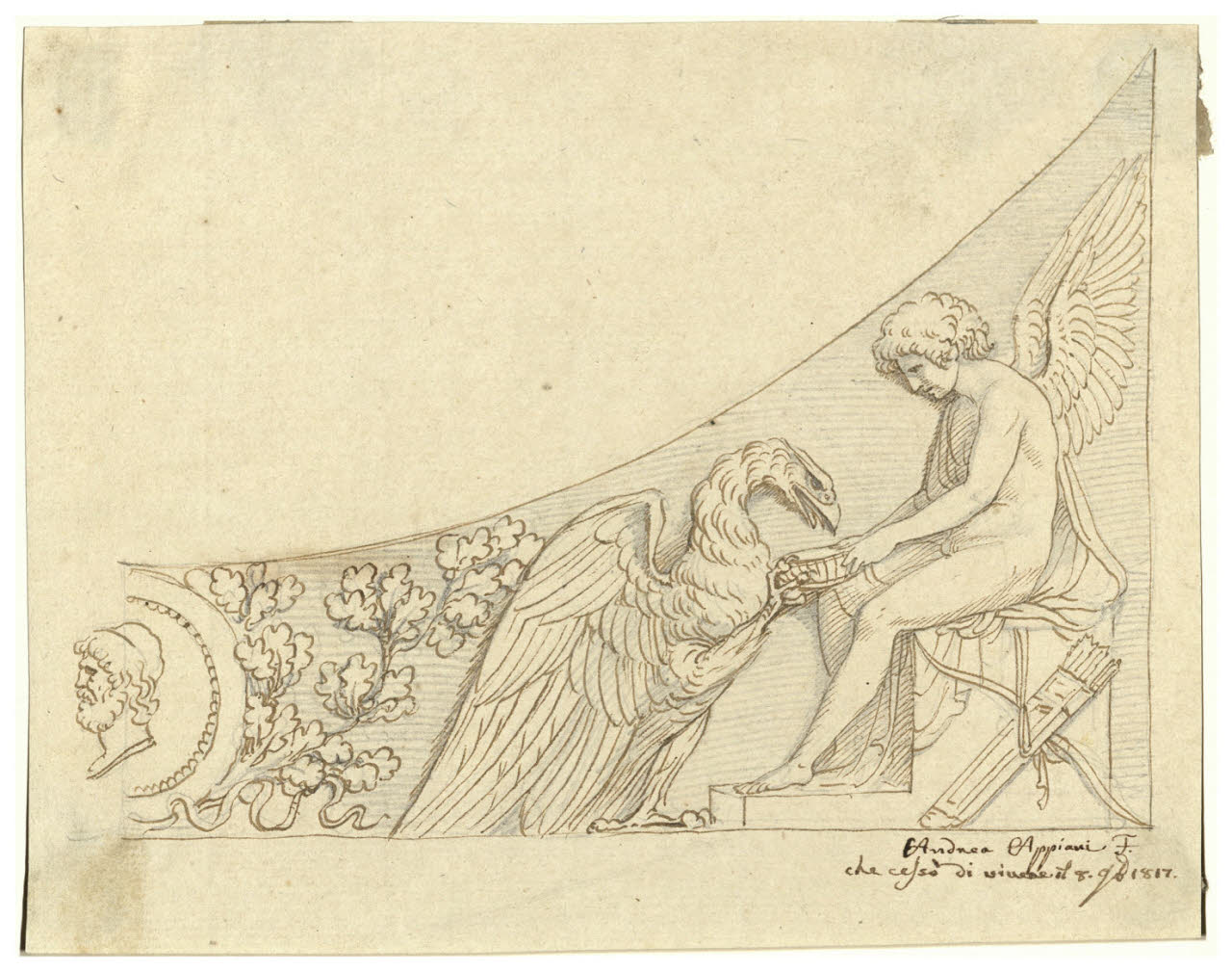 - NOTIZIE STORICO CRITICHE Si tratta di uno dei disegni che Appiani eseguì per l'officina di Giuseppe Maggiolini e che rimase nella bottega dell'ebanista e dei suoi eredi, come attesta l'iscrizione "Appiani che cessò di vivere il 8 9bre 1817", redatta con la grafia di Carlo Francesco Maggiolini, figlio di Giuseppe (Beretti 1998, p. 63). Molti fogli furono successivamente reimpiegati con minime varianti per intarsi databili alla fine del Settecento o ai primi anni dell'Ottocento, quando la collaborazione diretta fra Appiani e Maggiolini era oramai giunta al termine (Beretti 1998, pp. 72-73).\nIl disegno si ispira a un motivo antiquario, derivato probabilmente da un repertorio a stampa di modelli classici, secondo il modello de Le Antichità di Ercolano Esposte, una raccolta di volumi di incisioni che all'epoca godette di una vasta fortuna.