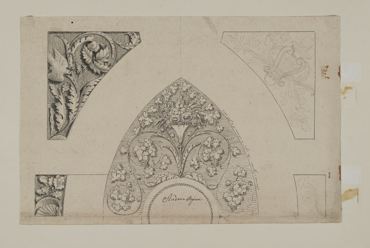 - NOTIZIE STORICO CRITICHE Foglio di eccellente qualità; ignoriamo se Appiani abbia eseguito disegni d'ornato. In questo foglio sono palesi i rapporti con alcuni disegni di Levati. A questo proposito va ricordato come il giovane Appiani, nei teleri per il Palazzo Arciducale, dipinse le figure negli ornati del Levati. (Beretta 1848, p.97) \n[Beretti - Gonzalez Palacios 2014]