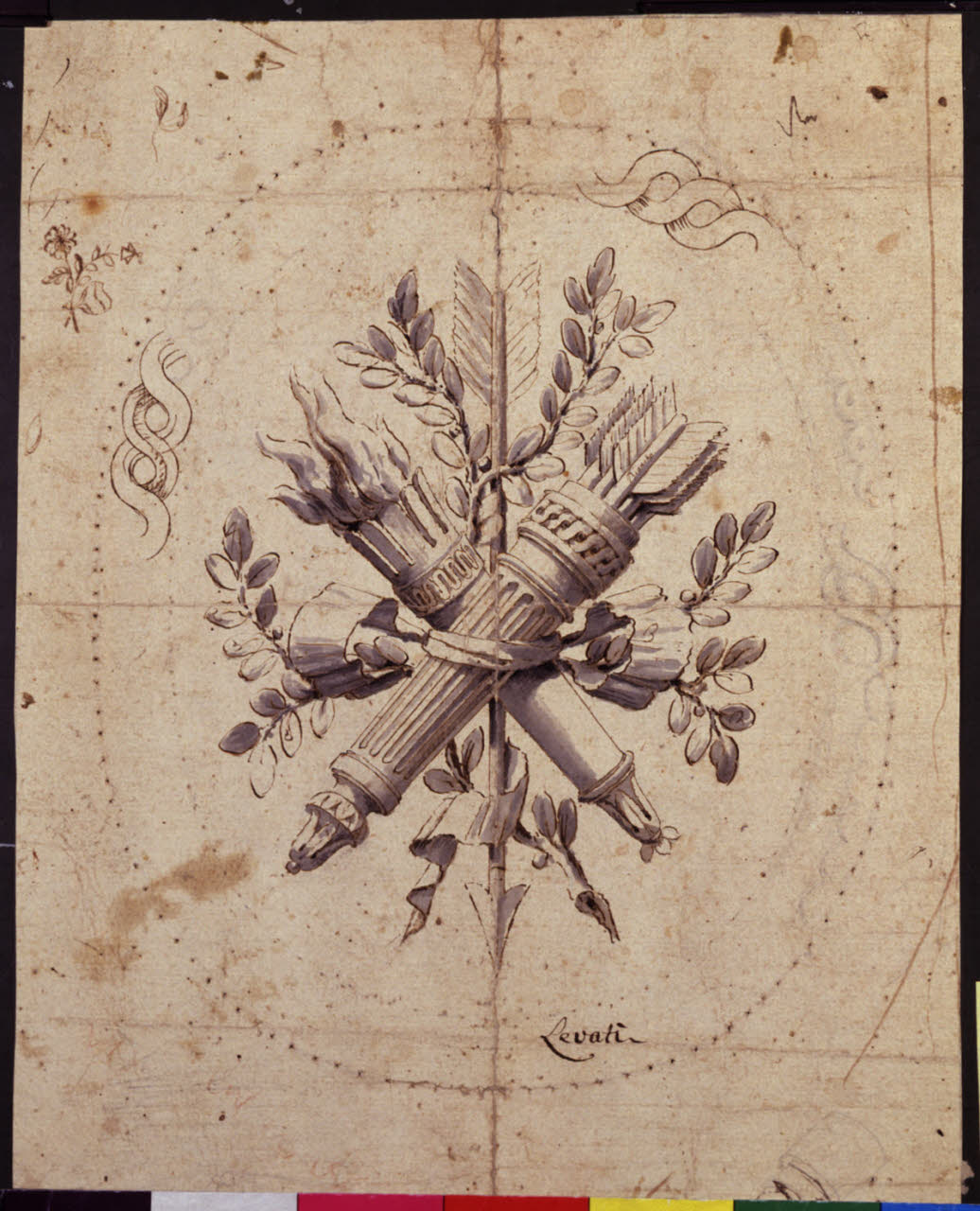- NOTIZIE STORICO CRITICHE La cornice ovale (con un accenno del suo ornato a catena) è stata traforata per lo spolvero quando il foglio fu impiegato per trarne la tarsia di un mobile.\n[Beretti - Gonzalez Palacios 2014]