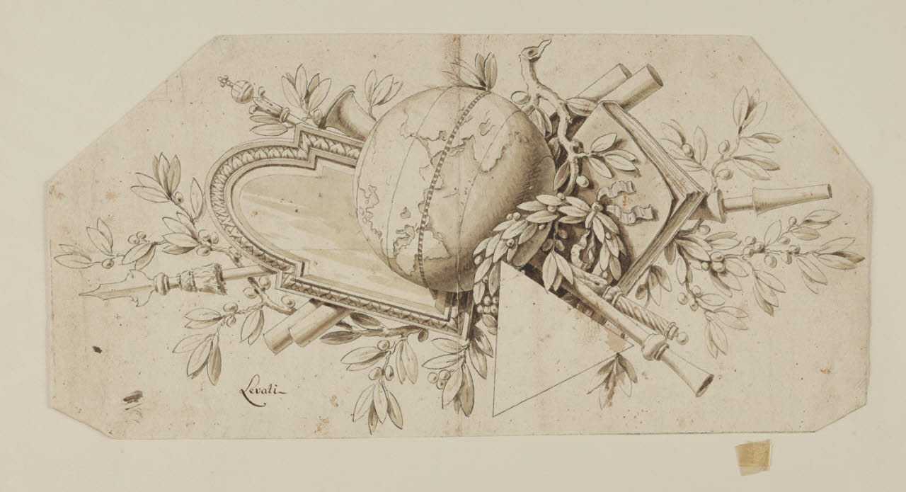 - NOTIZIE STORICO CRITICHE Il disegno, di ottima fattura, è attribuibile a Giuseppe Levati, come conferma la scritta. Il foglio è stato utilizzato per il piano di uno scrittoio reso noto da Morazzoni (1957, tav. XXIV), che noi crediamo essere appartenuto al Governatore plenipotenziario della Lombardia J.J. von Wilczek (si veda il foglio C 41). Andrà anche notato che la tecnica preziosa di questo disegno del Levati non è del tutto identica a quella dei fogli attribuibili allo stesso autore come, ad esempio, il C 51.\n[Beretti - Gonzalez Palacios 2014]