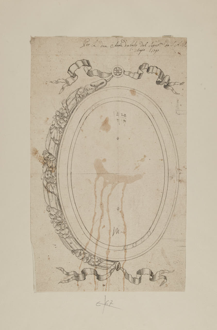 - NOTIZIE STORICO CRITICHE Questo disegno corrisponde esattamente alle cornici adoperate negli sportelli inferiori di un secrétaire conservato oggi nella Palazzina di Stupinigi e proveniente da Sala e dal Ducato di Parma (Gonzalez-Palacios 1968, I, p. 272; II, fig. 608). Ciò consente di datare il mobile oggi a Stupinigi al 1790; si vedano anche A 177, C 349, E 17.\n[Beretti - Gonzalez Palacios 2014]