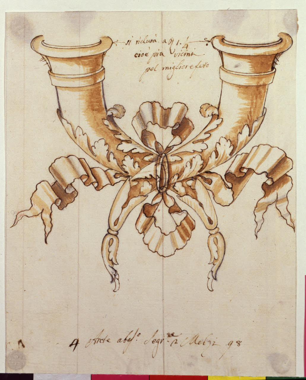 - NOTIZIE STORICO CRITICHE Questo foglio è stato utilizzato, con qualche variante, per due secrétaires già noti: il primo si trovava nel 1953 presso Nora Parrocchetti Melzi (Morazzoni 1953, tav. XXXII), il secondo apparve ad un'asta di Sotheby's ed è oggi in collezione privata (Beretti 2005, p. 80 e sgg.). Stando all'iscrizione sul presente foglio i mobili furono fatti per "Melzi", vale a dire per Francesco Melzi d'Eril, e la datazione 1798 sembra corrispondere a verità. Anche perchè l'altro cliente Melzi, il Don Gaetano documentato nel Fondo, aveva nel 1798 solo quindici anni. Francesco Melzi d'Eril (1753-1816) accolse Napoleone vincitore a Lodi nel 1796 ed ebbe in seguito il titolo di Duca di Lodi. Nel 1798 era uno degli uomini più potenti del Regno d'Italia. Il suo nome comparse spesso nel Fondo Maggiolini (si vedano gli Indici).\n[Beretti - Gonzalez Palacios 2014]
