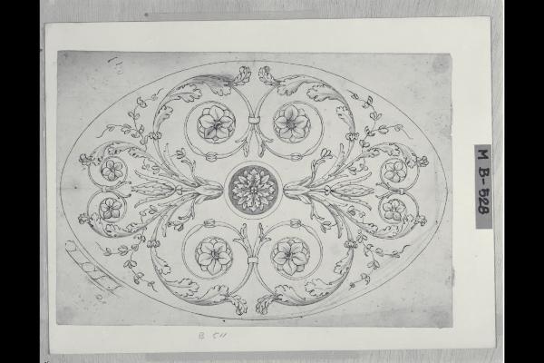 Intreccio a motivi fogliacei intorno a un rosone
