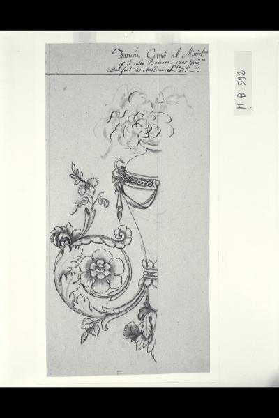 Vaso ricolmo di fiori con cespo e girale d'acanto