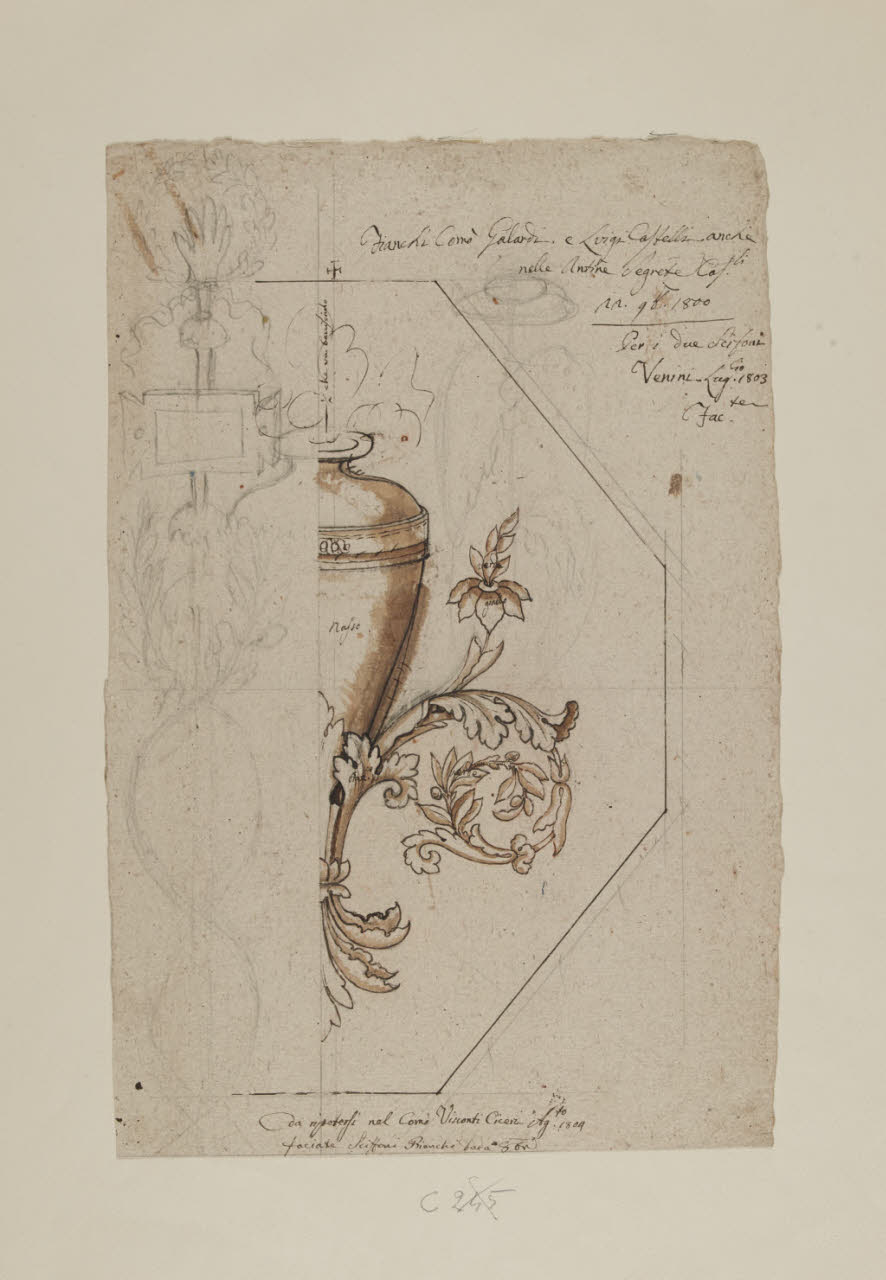 - NOTIZIE STORICO CRITICHE Questo foglio sembra avere avuto particolare fortuna, poichè fu utilizzato tra il 1800 e il 1804 per cinque committenti diversi: Galardi (C 312), Castelli (A 285), Venini (B 147, A 294), Visconti Ciceri (A 115), Bianchi d'Adda (B 419).\n[Beretti - Gonzalez Palacios 2014]