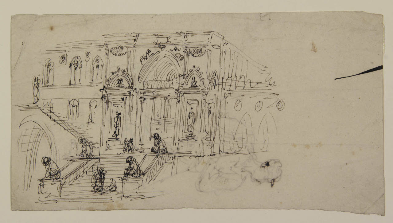 Prospettiva della facciata di un palazzo con scale, sculture e macchiette. Prospettiva della facciata di un palazzo con scale, sculture e macchiette