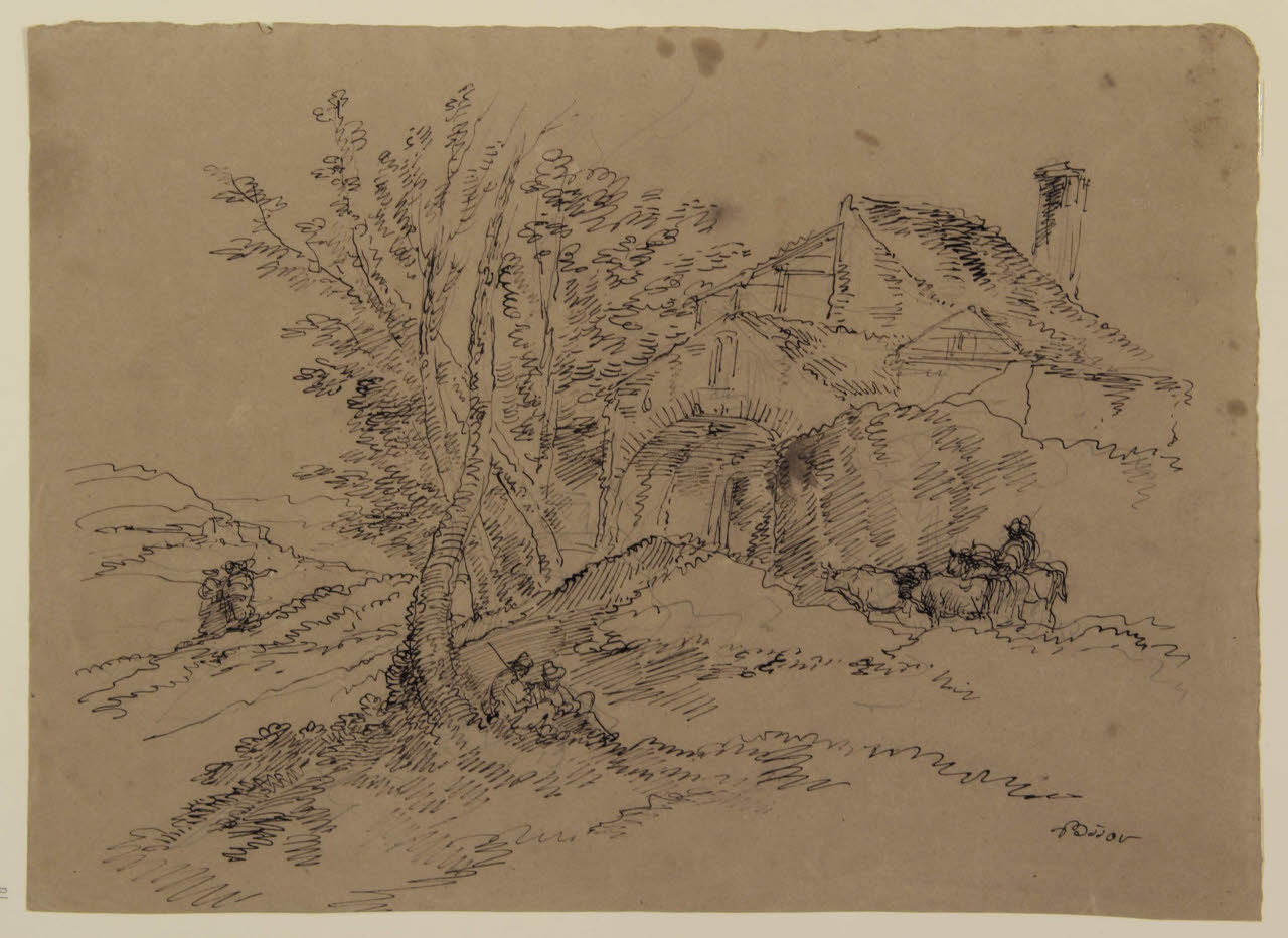 Paesaggio con casolare, vegetazione e figurette. Paesaggio con casolare, vegetazione e figurette