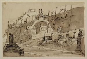 Veduta di un cimitero con figurette. Veduta di un cimitero con figurette