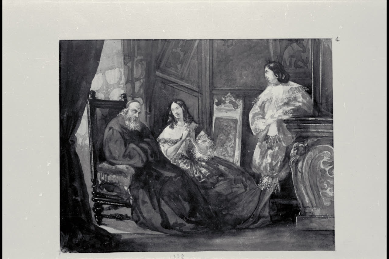 Scena storica in costume con un frate, un uomo e una donna