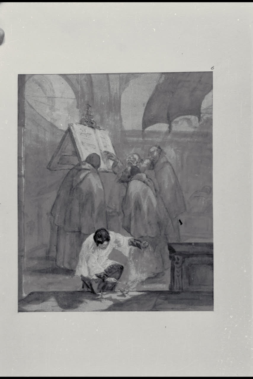 Interno di una chiesa con religiosi e un chierichetto