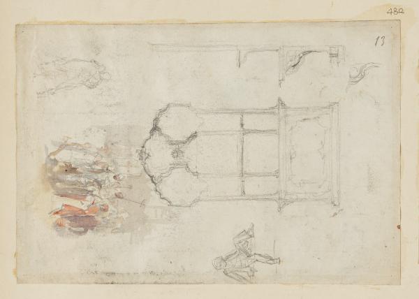 Particolari architettonici, composizione e schizzi di figurette. Particolari architettonici, composizione e schizzi di figurette