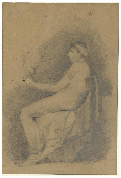 - NOTIZIE STORICO CRITICHE Già appartenuto alla collezione di Antonio Durini, questo disegno di Federico Faruffini illustra un nudo maschile seduto di profilo verso sinistra su una cathedra ed è avvicinabile per soggetto al dipinto intitolato "Toeletta antica" del 1865. La tela, dispersa e recentemente riapparsa sul mercato francese, fu esposta a Brera nel 1865 e probabilmente venduta a Parigi dal pittore. Il foglio in esame si deve inoltre mettere in relazione con una serie di lavori a soggetto femminile eseguiti da Faruffini tra 1864 e 1865, e con altri temi di rievocazione di scene e ambienti antichi, molto cari all'artista e di grande successo all'epoca.