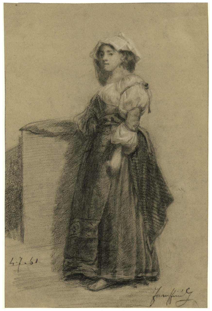 - NOTIZIE STORICO CRITICHE Già appartenuto alla collezione di Antonio Durini, questo disegno di Federico Faruffini illustra una donna stante in costume da ciociara, mentre si appoggia con il braccio ad un muretto. Il foglio venne realizzato dall'artista nel 1861, come si legge nella data manoscritta visibile in basso a sinistra. Si tratta di un'ulteriore testimonianza dell'interesse, divenuto preminente per Faruffini durante l'ultimo soggiorno a Roma, per il repertorio folcloristico romano, che aveva prodotto disegni, bozzetti, dipinti e anche ritratti a mezzo fotografico. In effetti, dopo l'esperienza parigina, di ritorno nella capitale, Faruffini dovette adeguarsi alle richieste di mercato, dedicandosi a temi aneddotici e al genere da souvenir, come ciociare e popolani in costume. Sebbene non si conosca un dipinto corrispondente a questa composizione, la rifinitura del disegno suggerisce che si tratti di uno studio finalizzato a un'opera di maggiore compiutezza.