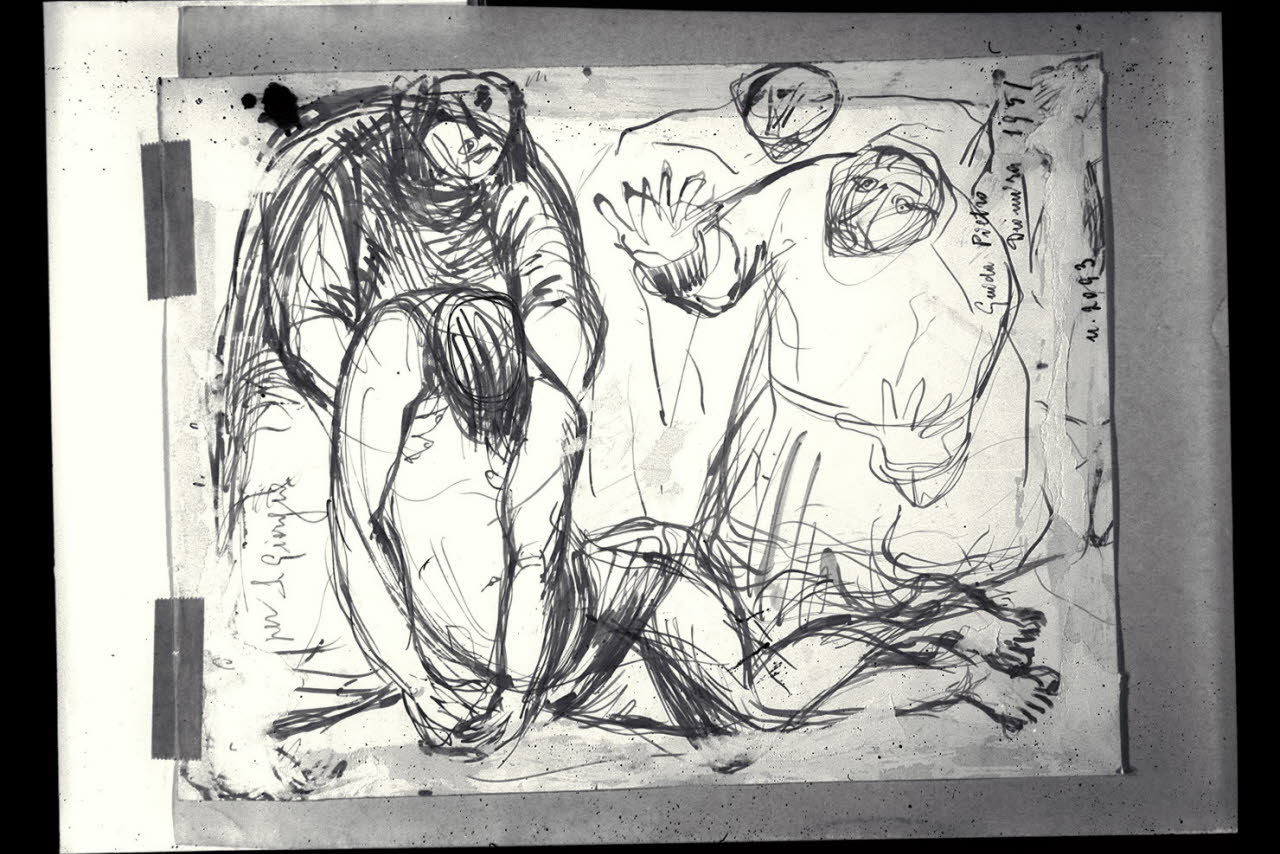 matita, inchiostro rosso a penna e pennello su carta bianca