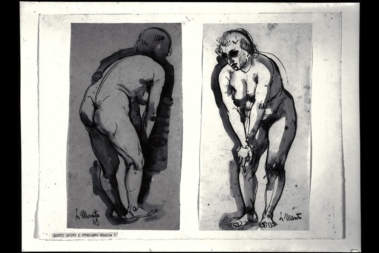 inchiostro seppia a penna, acquerellatura d'inchiostro su carta grigia incollata su carta bianca