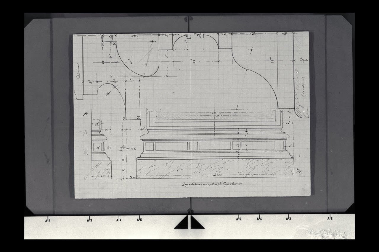 Sezione ed alzato con dettaglio in scala maggiore della zoccolatura per quadro San Girolamo nella Nuova Pinacoteca Vaticana