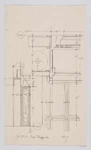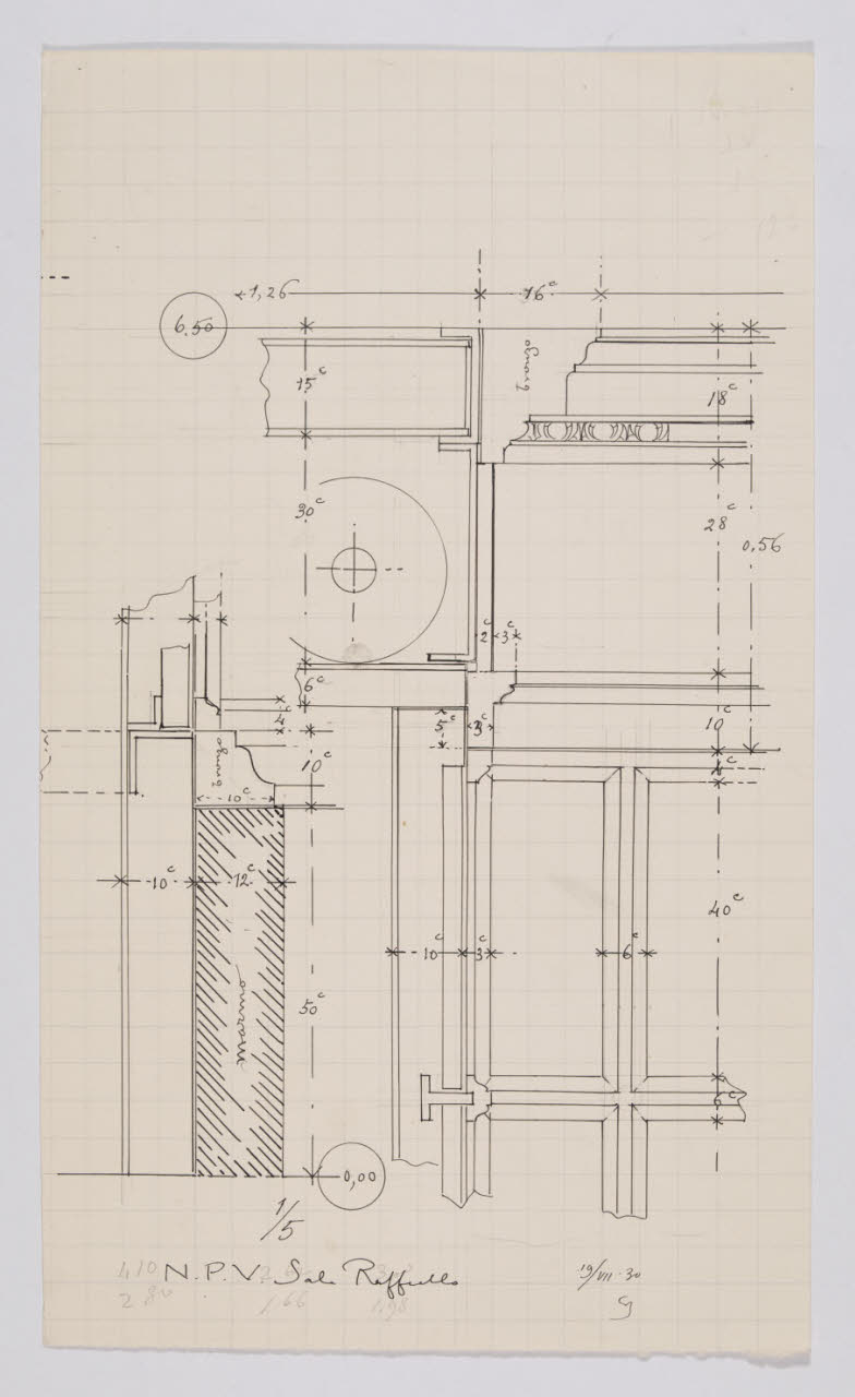 Alzato e sezione del dettaglio delle vetrine e del meccanismo che regge gli arazzi della sala di Raffaello nella Nuova Pinacoteca Vaticana