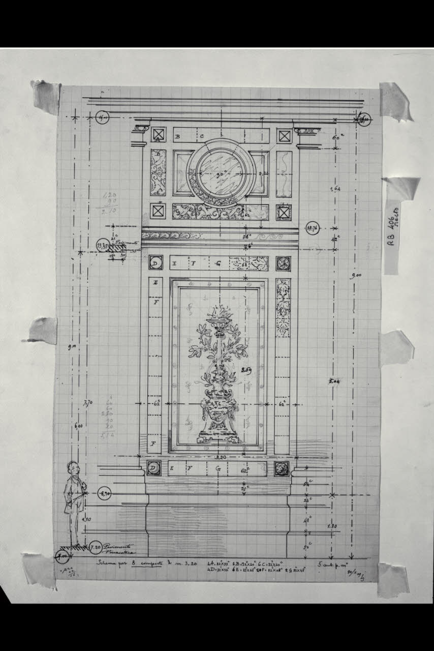 Alzato con indicazione delle decorazioni del prospetto verso il giardino nella Nuova Pinacoteca Vaticana