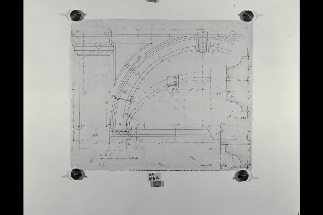 Alzato con dettagli delle sezioni dell'archivolto e del fregio dell'arco della nicchia centrale nella Nuova Pinacoteca Vaticana