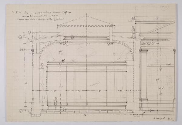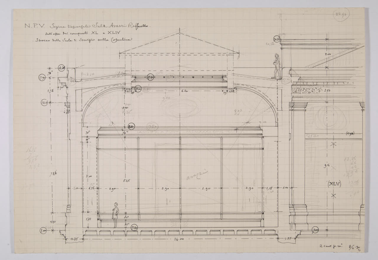 Sezione trasversale della sala degli arazzi di Raffaello e dello sbocco della scala di servizio sulla copertura nella Nuova Pinacoteca Vaticana