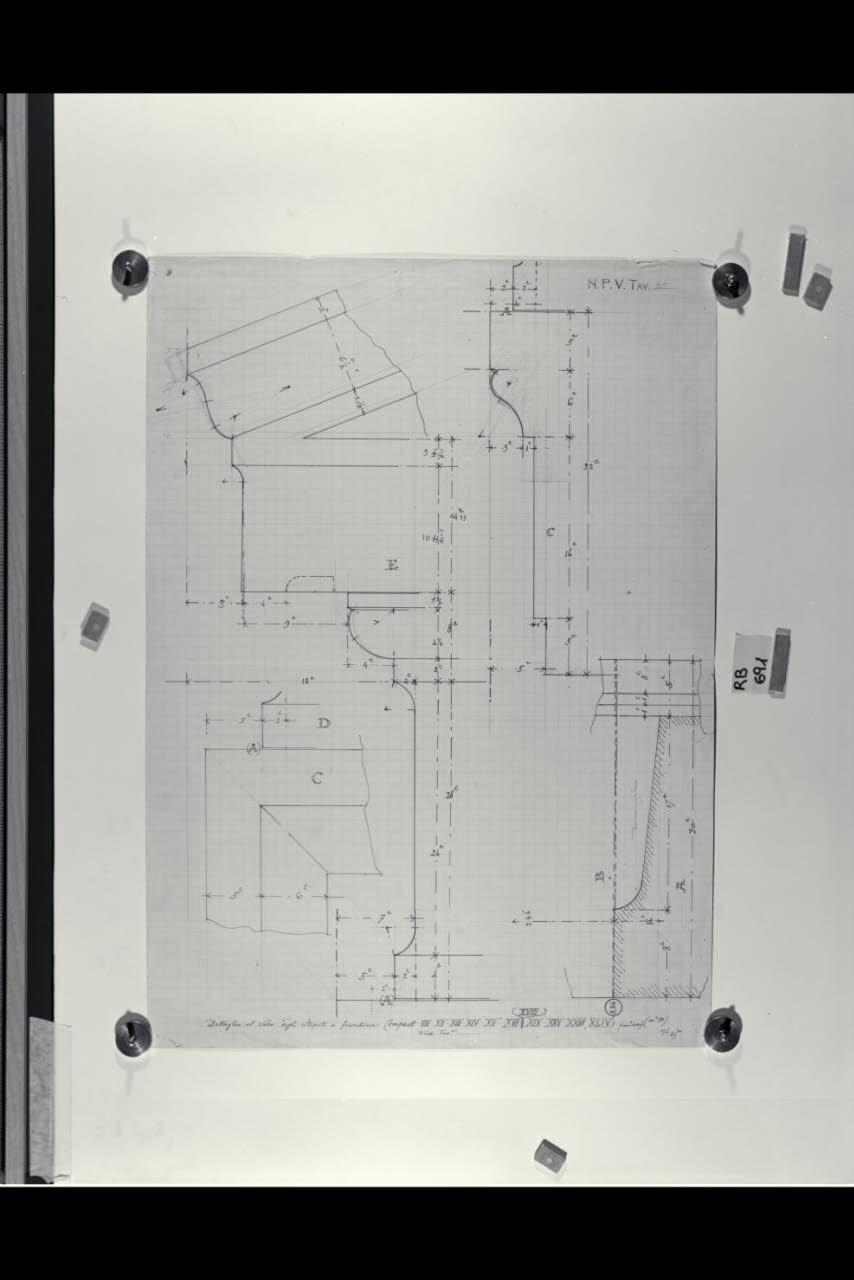 Piante, sezioni e prospetti dei dettagli degli stipiti e del frontone nella Nuova Pinacoteca Vaticana