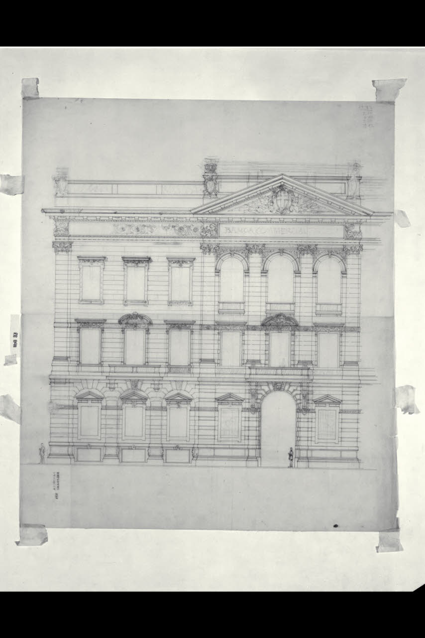 Dettaglio del prospetto verso piazza della Scala della sede di Milano della Banca Commerciale Italiana in piazza della Scala e via Manzoni. Dettaglio del prospetto verso piazza della Scala della sede di Milano della Banca Commerciale Italiana in piazza della Scala e via Manzoni