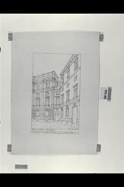 Prospetto della fronte in Fronte in via Silvio Pellico della sede centrale di Milano della Banca Commerciale Italiana in piazza della Scala e via Santa Margherita. Prospetto della fronte in Fronte in via Silvio Pellico della sede centrale di Milano della Banca Commerciale Italiana in piazza della Scala e via Santa Margherita