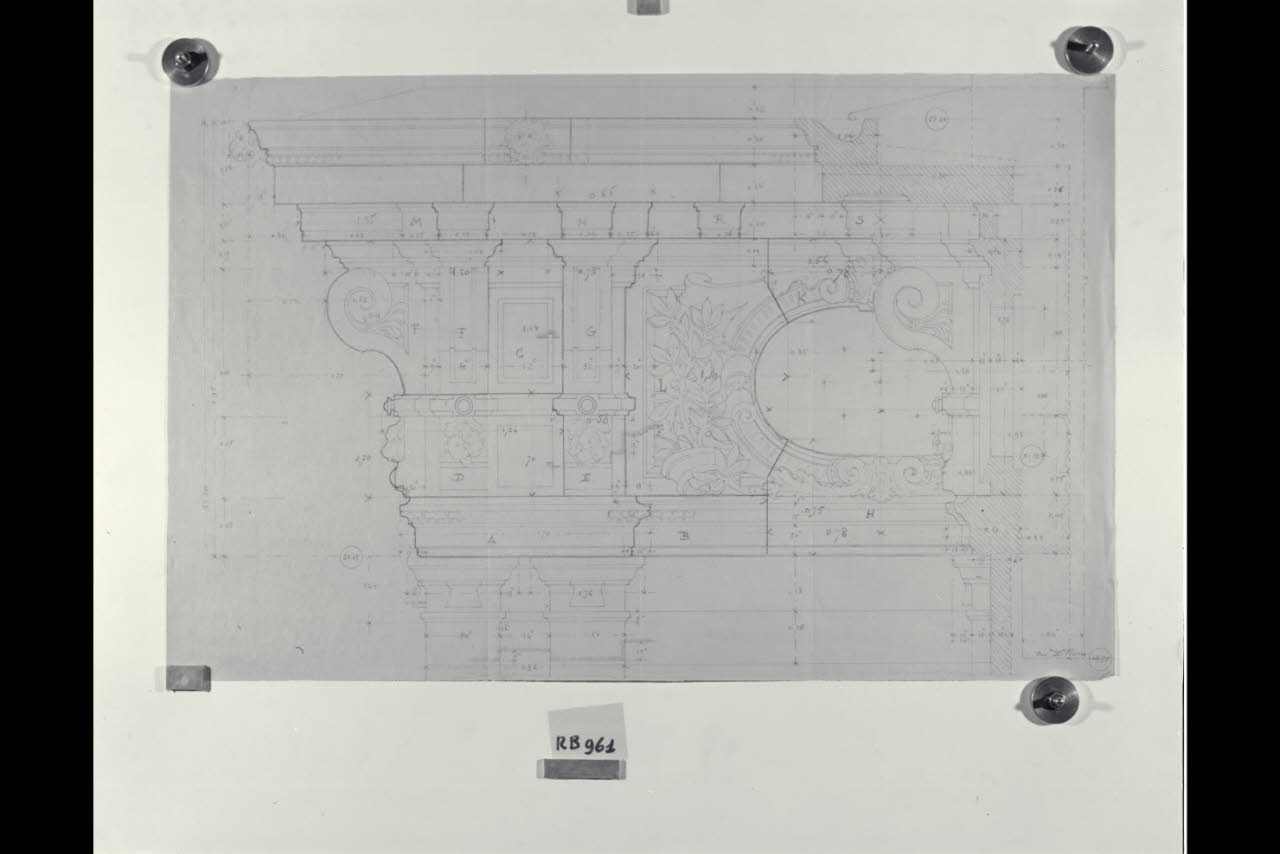Alzato e sezione di un particolare della cornice nella sede centrale di Milano della Banca Commerciale Italiana in piazza della Scala e via Santa Margherita. Alzato e sezione di un particolare della cornice nella sede centrale di Milano della Banca Commerciale Italiana in piazza della Scala e via Santa Margherita